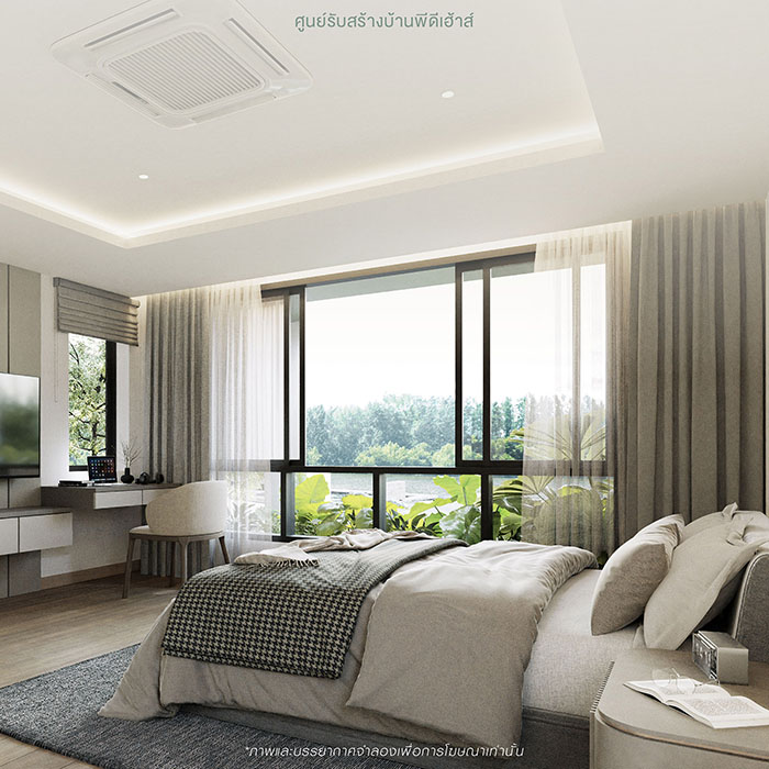 บ้านสไตล์โมเดิร์นที่ผสมผสานความทันสมัยให้สอดรับกับธรรมชาติและสภาพอากาศในเขตร้อนชื้นอย่างประเทศไทยได้อย่างลงตัว ตัวอาคารดีไซน์ทันสมัยมีชายคาที่ยื่นยาวบดบังแสง พร้อมช่องเปิดที่เปิดรับแสงและลมจากธรรมชาติ แต่งเติมด้วยระแนงเพิ่มมิติให้กับตัวอาคารและลดทอนความร้อนจากแสงแดดภายนอก คุมโทนสีให้สอดรับกับบรรยากาศโดยรอบ ภายในถูกออกแบบให้มี Space ที่สูงโปร่งเพื่อให้ลมพัดผ่านได้ ทุกฟังก์ชันถูกจัดสรรให้ใช้งานได้อย่างสะดวกสบาย ตอบโจทย์กับการใช้ชีวิตในทุกช่วงวัย อุ่นใจด้วยห้องนอนผู้สูงอายุบริเวณชั้นล่าง เหมาะสำหรับครอบครัวขนาดใหญ่ ลงตัวกับการใช้ชีวิตในยุคปัจจุบัน