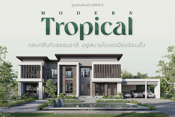 Modern Tropical บ้านที่ถูกดีไซน์มาให้สอดรับกับสภาพอากาศภูมิประเทศร้อนชื้นอย่างประเทศไทย โดยคำนึงถึงทิศทางของแสงและลม ตัวอาคารถูกออกแบบให้มีชายคาที่ยื่นยาว พร้อมระแนงที่ถูกนำมาตกแต่งเพื่อลดทอนแสงแดดและความร้อนแต่ยังกลมกลืนไปกับธรรมชาติ เน้นการออกแบบให้บ้านมีพื้นที่โปร่ง โล่ง พร้อมช่องเปิดโดยรอบเพื่อให้แสงแดดส่องและลมพัดผ่านเข้าภายในบ้าน ทำให้มีการถ่ายเทอากาศได้ดีกว่าปกติ พร้อมคุมโทนสีเอิร์ธโทน เพื่อให้ดูสบายตาและดูอบอุ่น ทุกฟังก์ชันถูกออกแบบให้สามารถใช้งานได้อย่างสะดวกสบาย พร้อมห้องนอนผู้สูงอายุบริเวณชั้นล่าง เหมาะสำหรับการใช้งานในทุกช่วงวัยตอบรับการใช้ชีวิตในทุกวัน