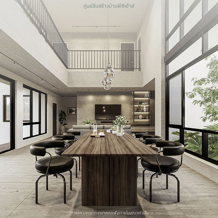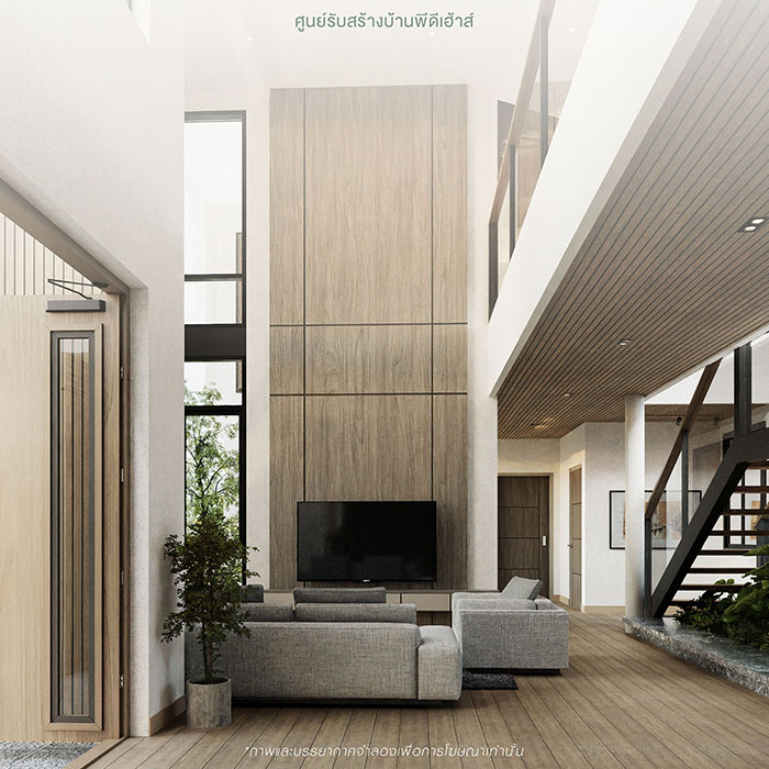 บ้านสไตล์โมเดิร์นที่ตอบโจทย์การใช้ชีวิตในยุคปัจจุบันเหมาะกับสภาพภูมิอากาศในเขตร้อนชื้นด้วยเอกลักษณ์การสร้างพื้นที่หรือ Space ให้โปร่งโล่ง โดดเด่นด้วยชายคาที่ยื่นยาวและระแนงที่แต่งเติมเพิ่มมิติให้กับตัวอาคารพร้อมช่วยลดทอนความร้อนจากแสงแดด เปิดรับแสงและลมจากธรรมชาติได้รอบทิศเน้นความเรียบง่ายทันสมัย ภายในคุมโทนสีอ่อนเพื่อให้ดูอบอุ่นและออกแบบให้ทุกฟังก์ชันเชื่อมต่อกันเพื่อความสะดวกในการใช้งาน พร้อมห้องนอนผู้สูงอายุบริเวณชั้นล่าง เหมาะสำหรับครอบครัวขนาดใหญ่ ตอบรับการอยู่อาศัยได้อย่างสมบูรณ์แบบ